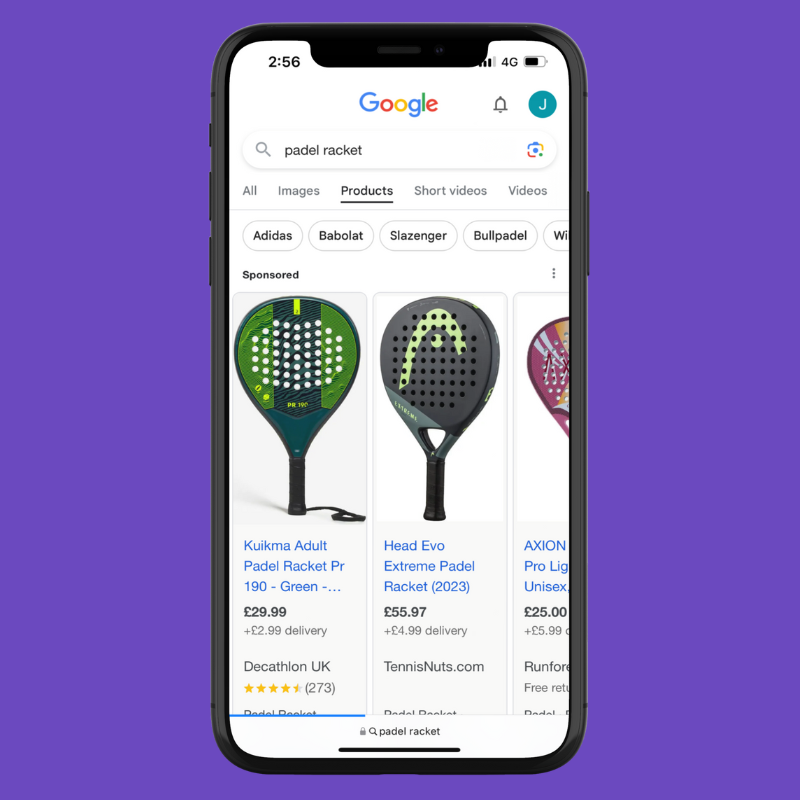 Just like with search results for webpages and articles, the first results in the feed will be paid adverts, allowing businesses just like yours to showcase your products directly from this initial search. These are Google Shopping Ads. Take the below example of someone searching for “padel racket” in the UK. The first result is the Google Shopping feed showing 8 potential rackets that have been advertised by Decathlon UK, TennisNuts.com and Amazon.co.uk and are showing under a “Sponsored” title to show these are ads.